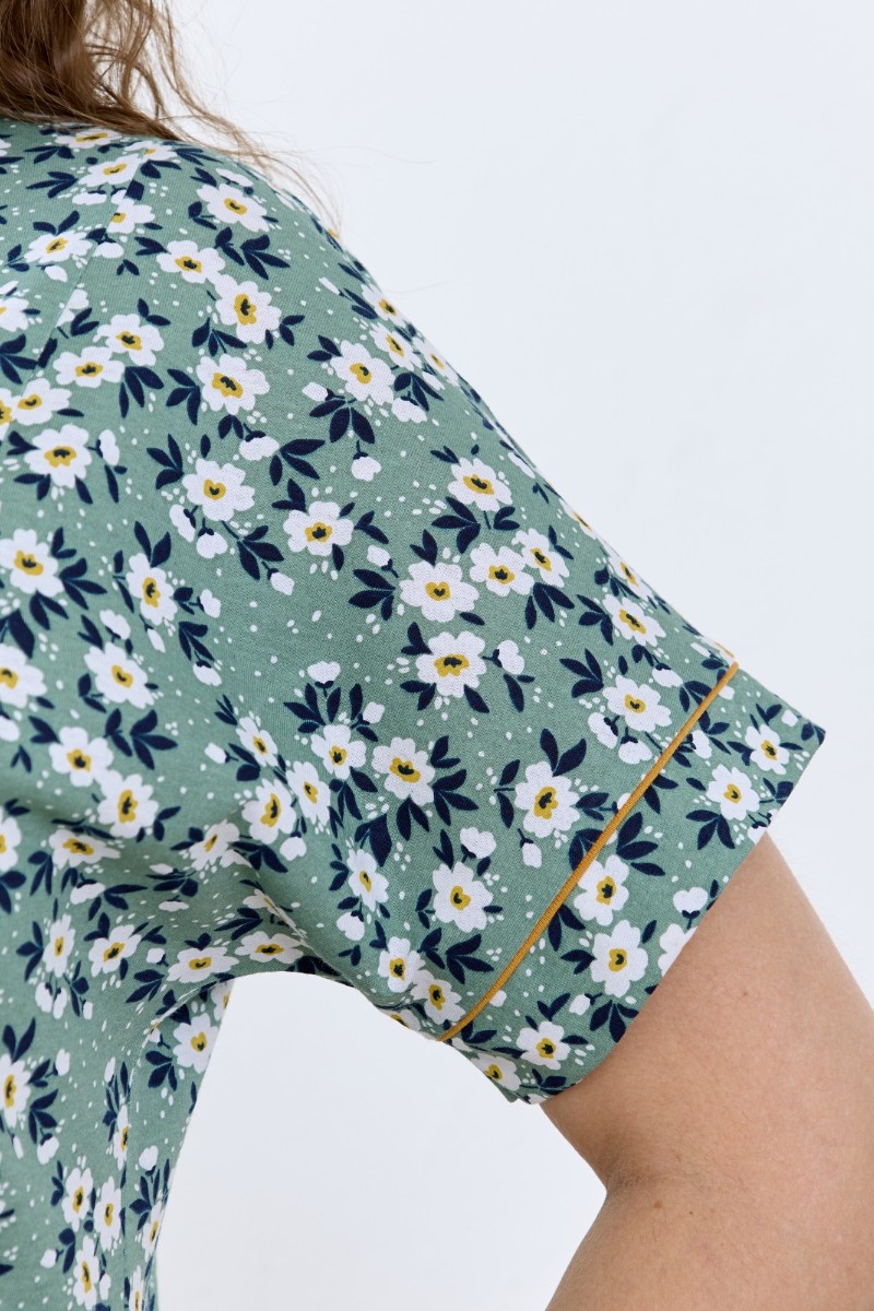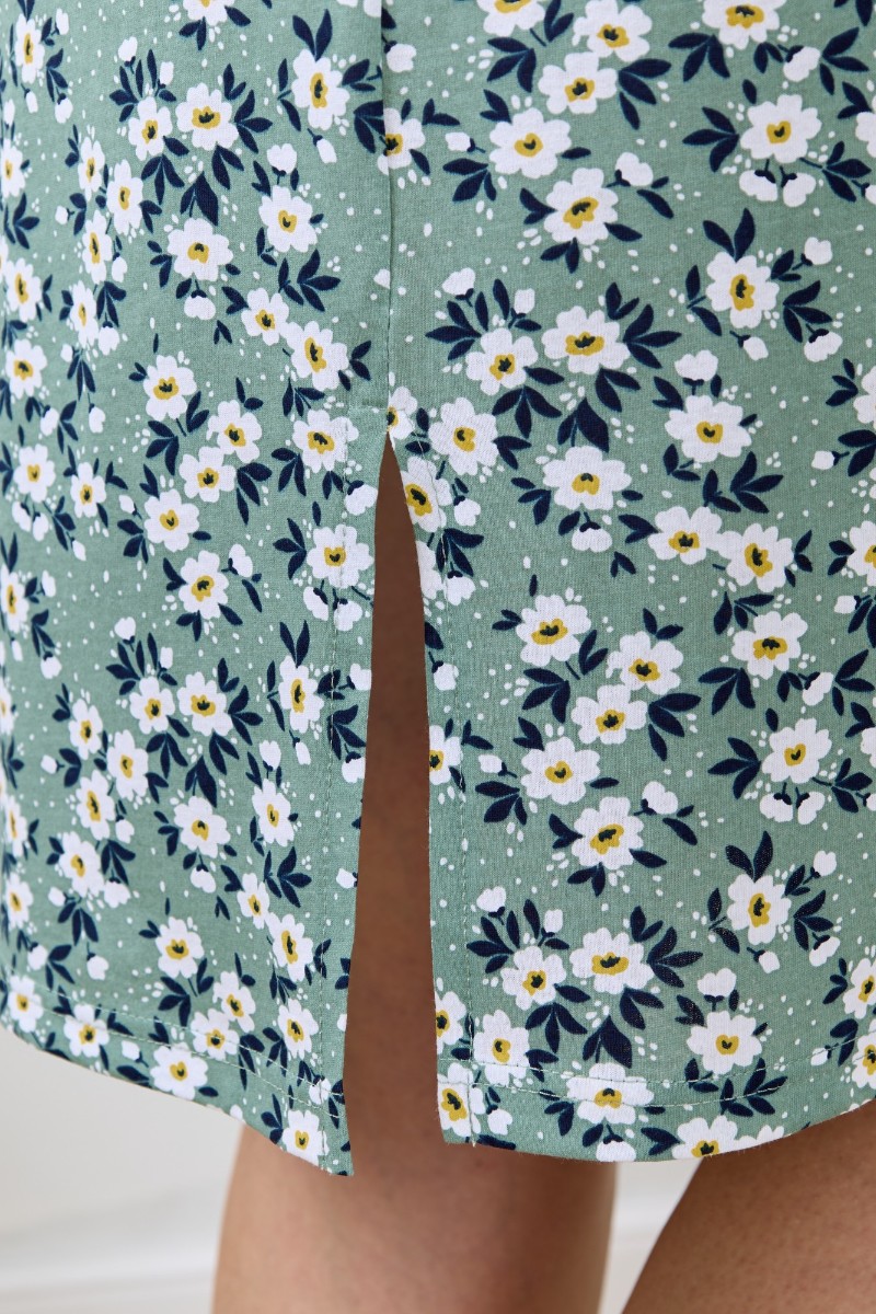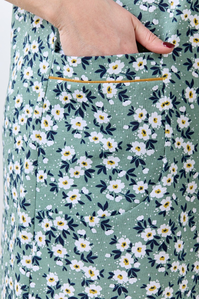 Представляем Вашему вниманию халат женский из трикотажного полотна «кулирка» с набивным рисунком, свободного покроя, расширенный к низу, с короткими цельнокроеными рукавами, горловиной овальной формы, окантованной двойным кантом и разрезами в боковых швах, центральной бортовой застежкой на тесьму « молния». Рукава с притачными манжетами и кантом, полочки с отрезными бочками в нижней части и боковыми карманами на уровне бедер. Верхние срезы карманов обработаны притачными планками с кантом.