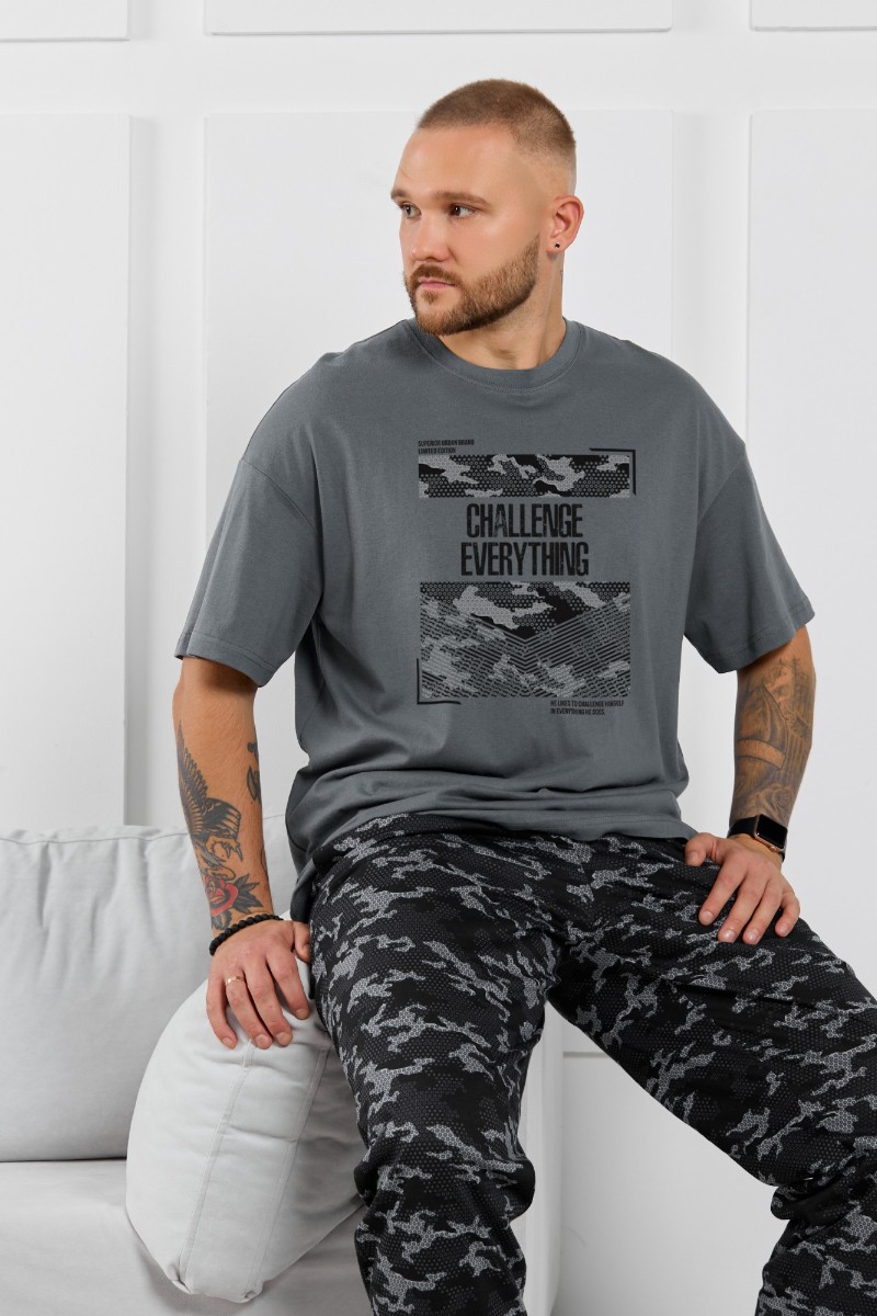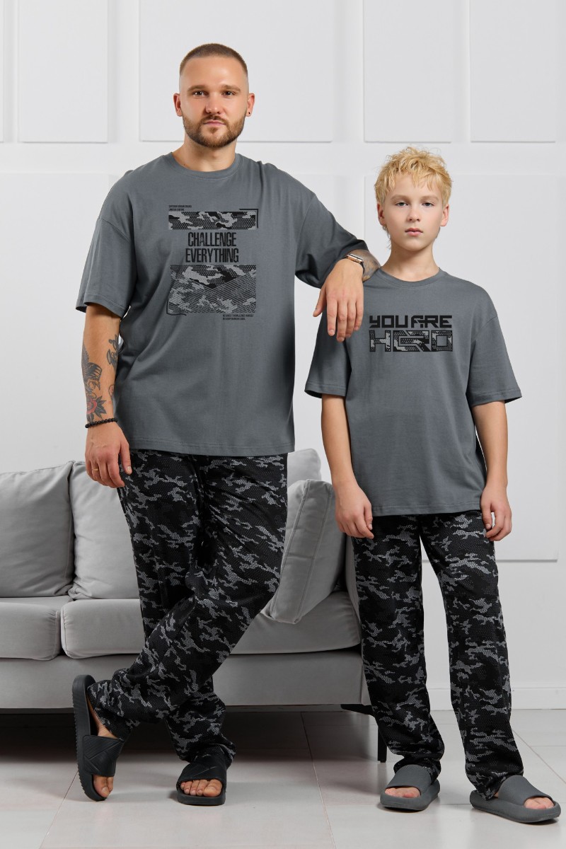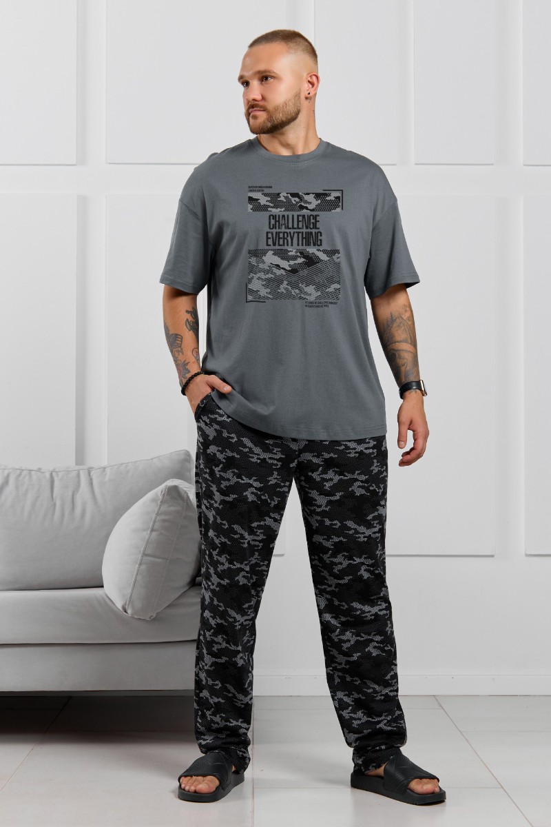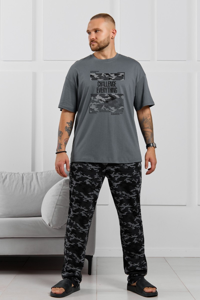Представляем Вашему вниманию костюм мужской, состоящий из футболки и брюк. Футболка однотонная с принтом на груди; модель свободная, со спущенной линией плеч, овальным вырезом горловины. Брюки из полотна с набивным рисунком эксклюзивного дизайна, прямые, с боковыми карманами с обтачными входами, на притачном поясе с отстроченной эластичной тесьмой.