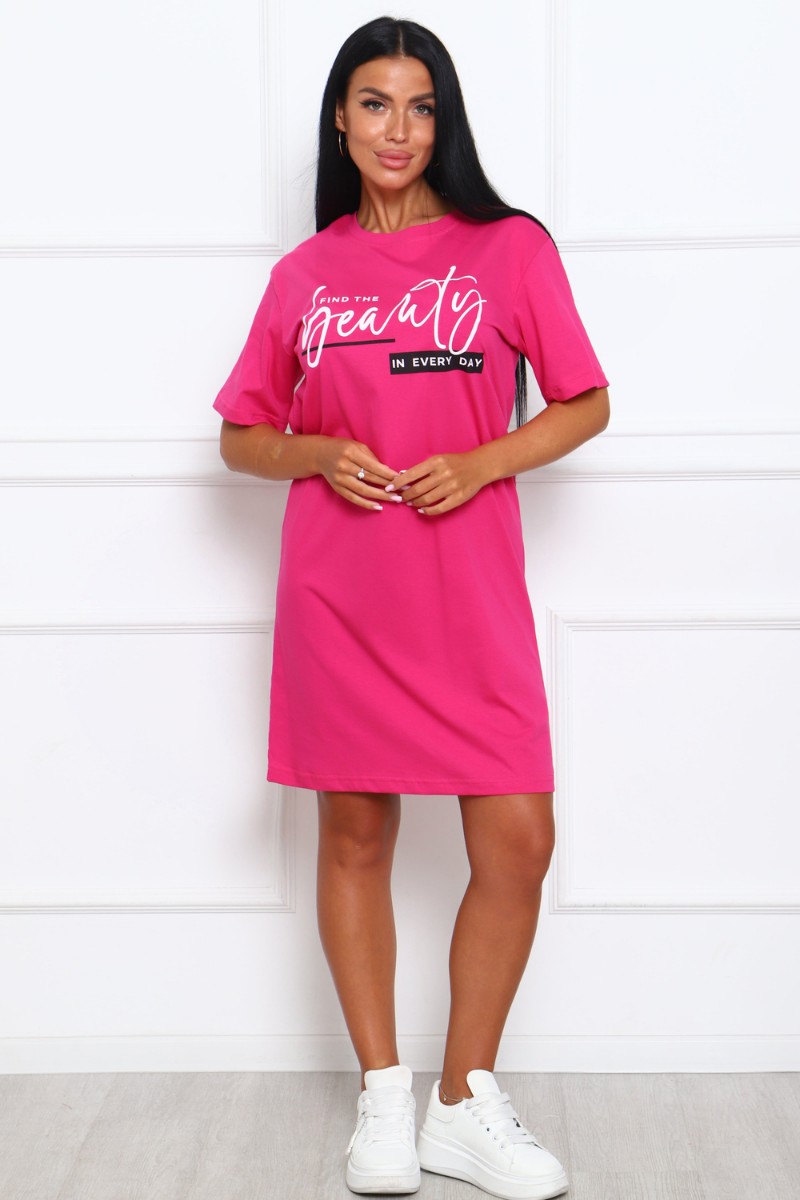 Представляем Вашему вниманию изящную женскую тунику прямого силуэта. Низ изделия прямой. Длина выше колена, плечо спущенное, рукав короткий. Горловина круглой формы, обработана планкой с отделочной строчкой по шву притачивания. Принт (шелкография) располагается по центру переда.