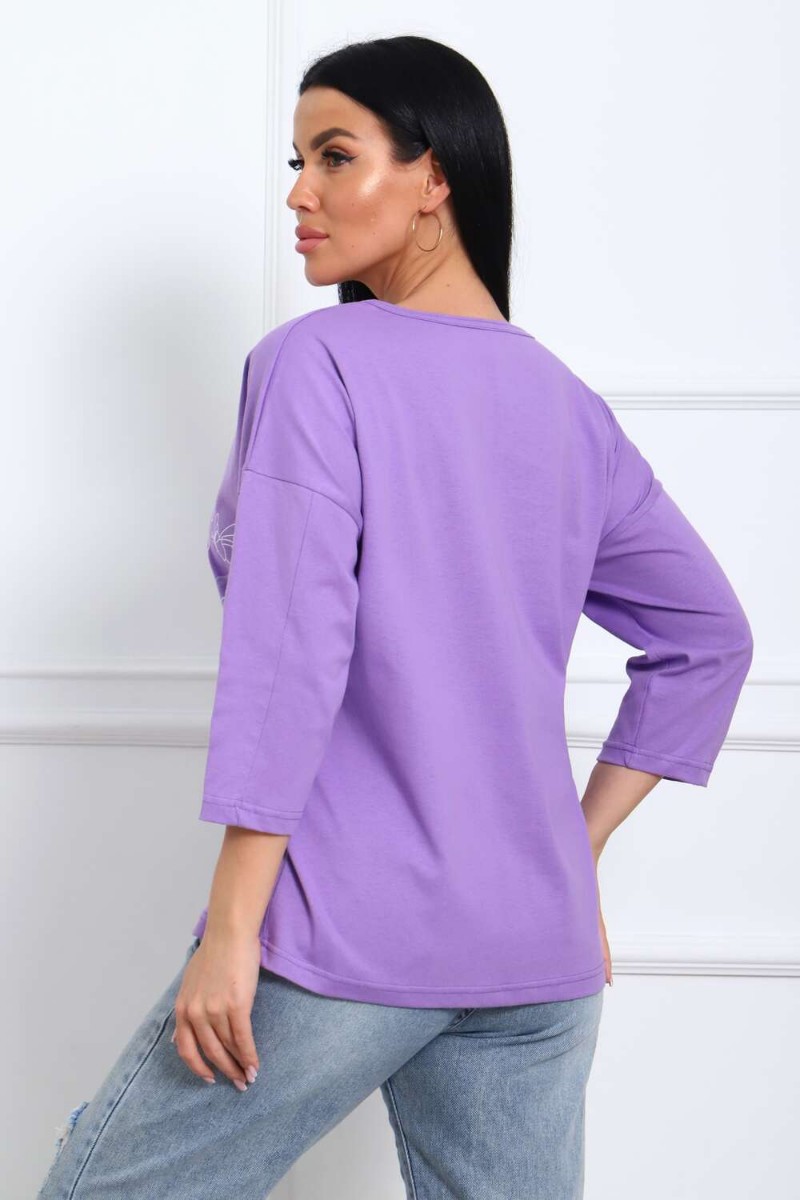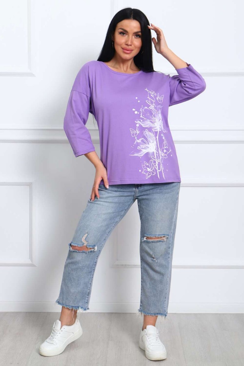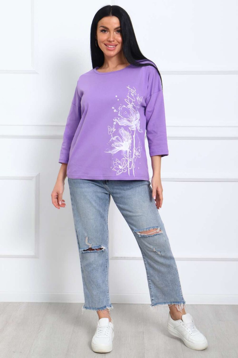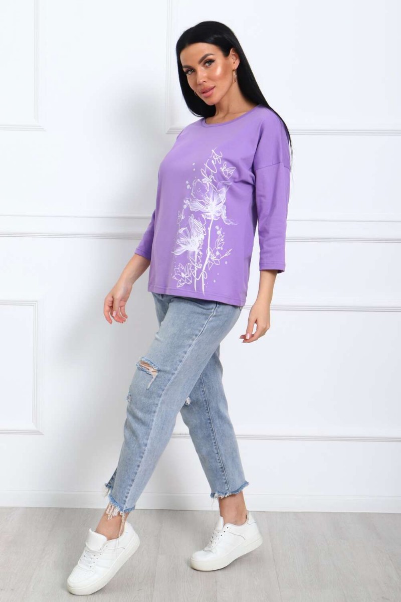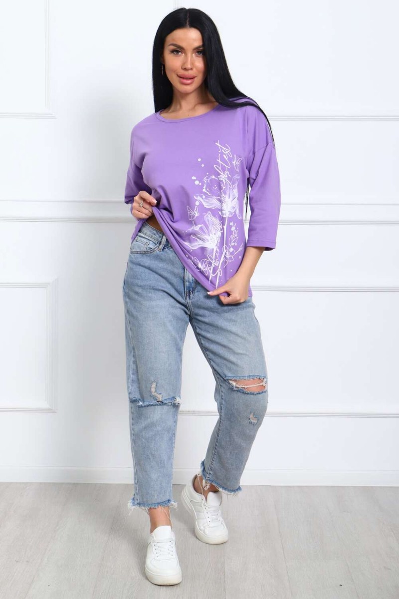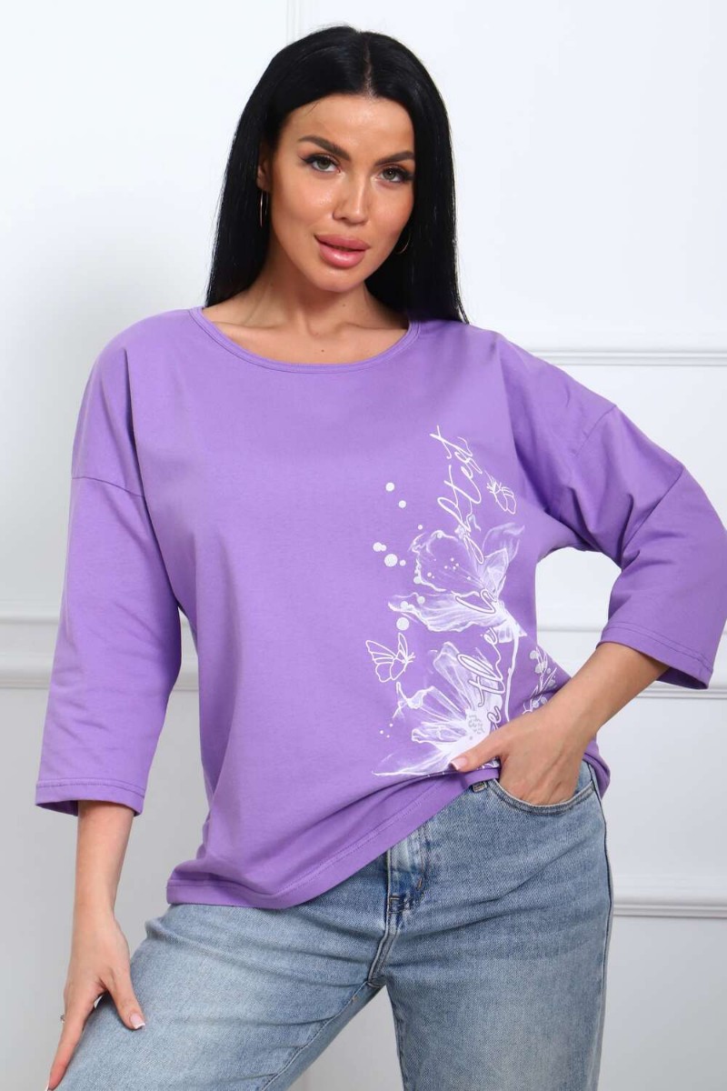 Представляем Вашему вниманию изящную женскую тунику. Ткань кулирка, хлопок 100%. Крой свободный, горловина круглой формы, обработана окантовкой. Линия плеч спущена. Длинна рукава 3/4, со швом по локтю. Низ изделия прямой. На полочке принт, шелкография.
