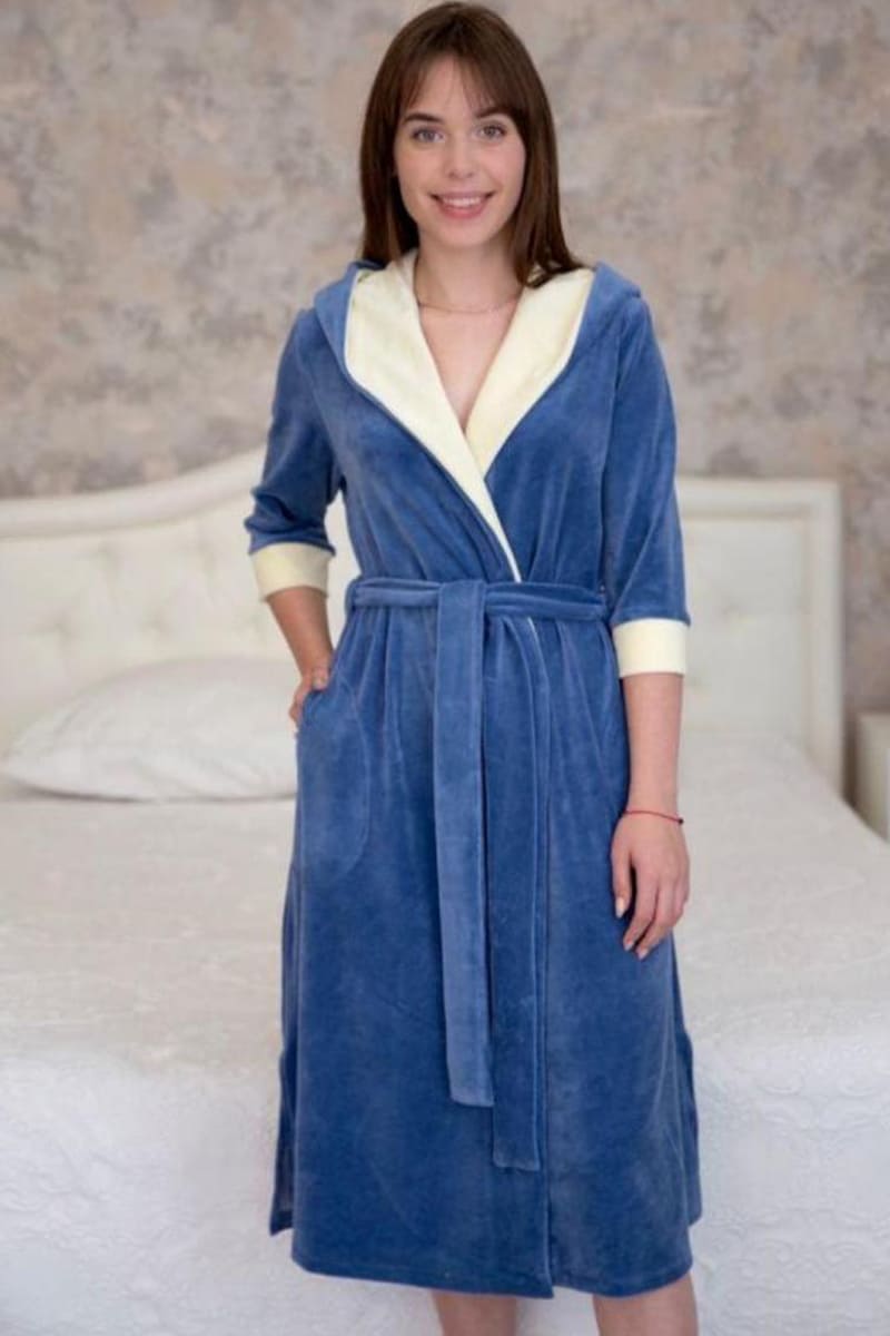 Представляем Вашему вниманию великолепный женский велюровый халат на запах до середины икры, выполненный в элегантном синем цвете. Объемный капюшон и манжеты в противовес общему оформлению отделаны материалом нежно молочного оттенка. Этот уютный халат поможет забыть о проблемах и окунуться с головой в негу удовольствия.