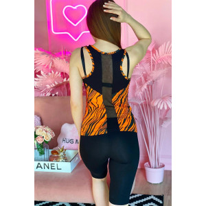 Представляем Вашему вниманию яркую женскую майку-борцовку прилегающего силуэта, средней длины, с округлой горловиной. Вдоль спинки расположена вставка из сетки. Горловина и проймы майки обработаны бейкой из основного полотна.
