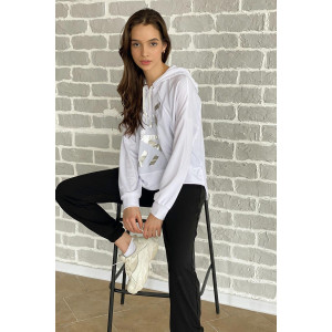 Представляем Вашему вниманию стильную женскую толстовку. Толстовка прямая, укороченная, с капюшоном, на поясе. Рукав длинный, на манжете. Спинка удлиненная, на поясе. На полочке расположены симметричные кокетки и пояс. В нижней части боковых швов обработаны разрезы.