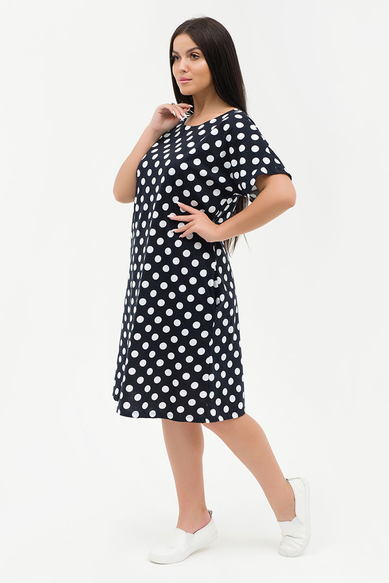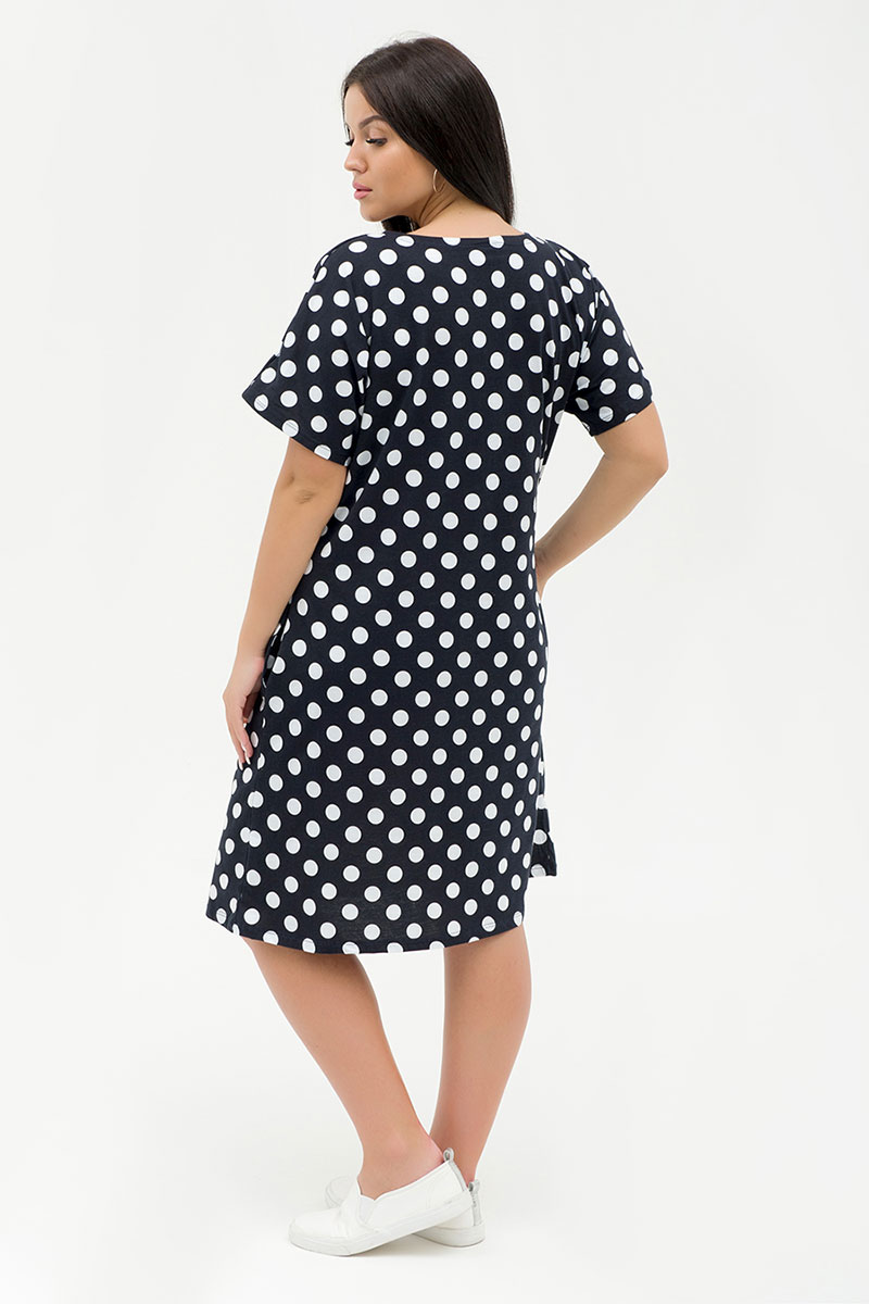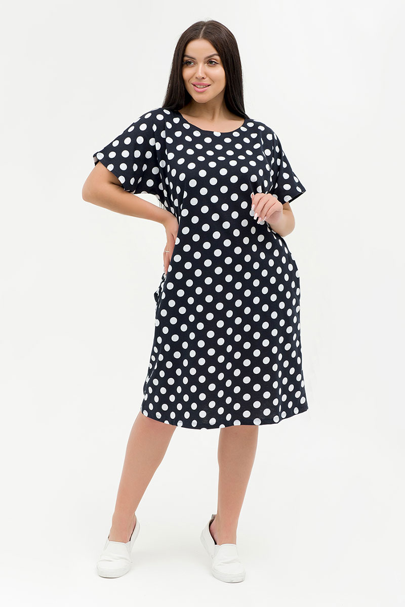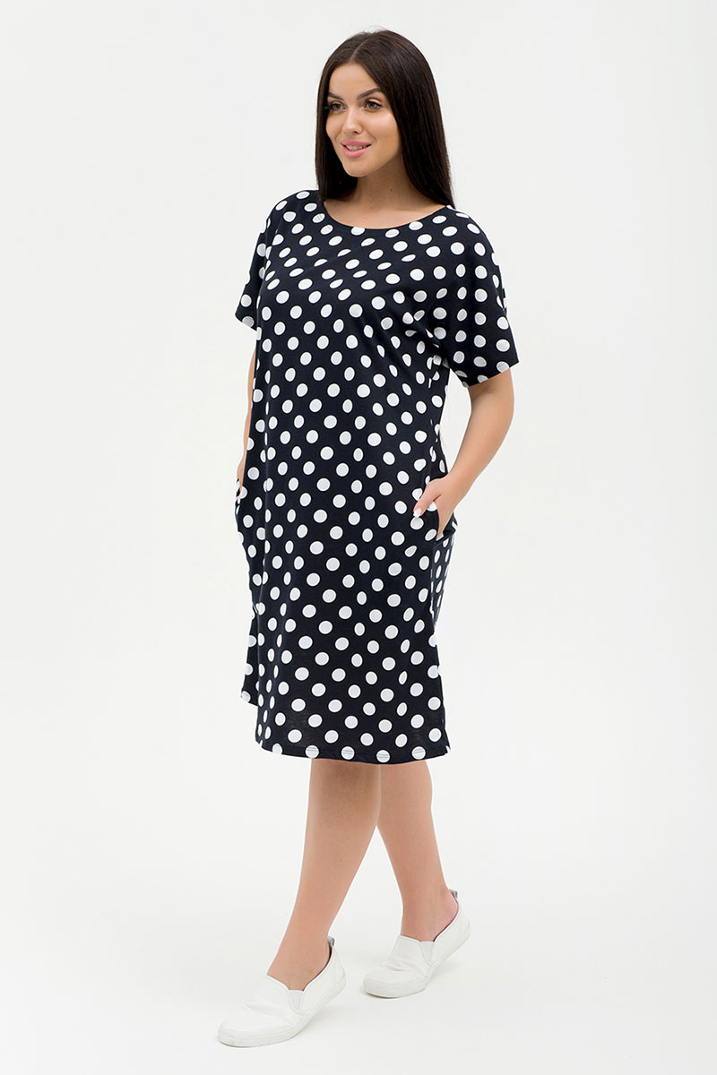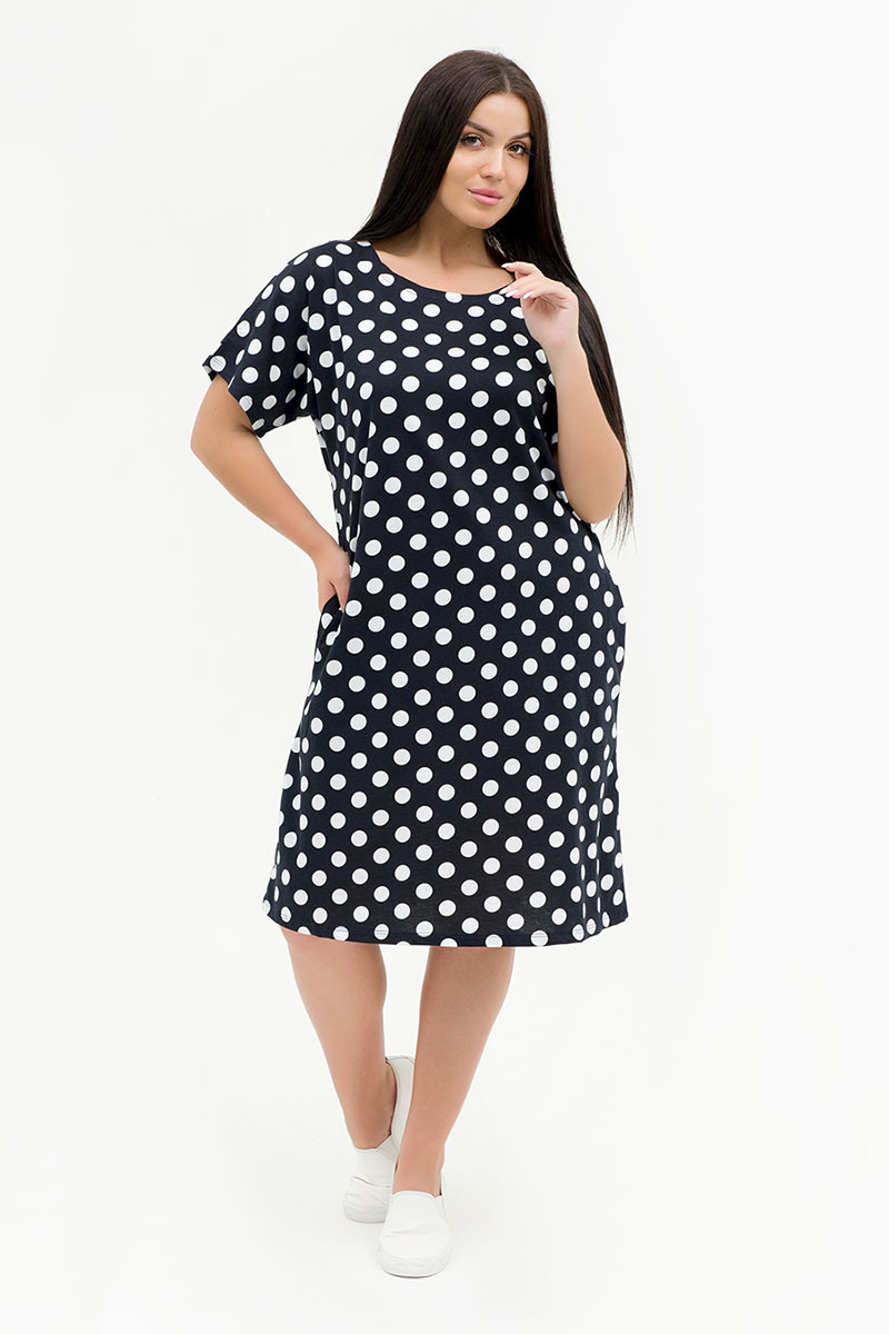 Представляем Вашему вниманию эффектную женскую тунику свободного кроя, дополненную короткими рукавами и вшивными карманами по бокам. Длина до колена. Принт в виде контрастного, белого гороха. Круглый вырез. Обеспечит максимум комфорта и полную свободу движений в повседневной носке.