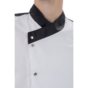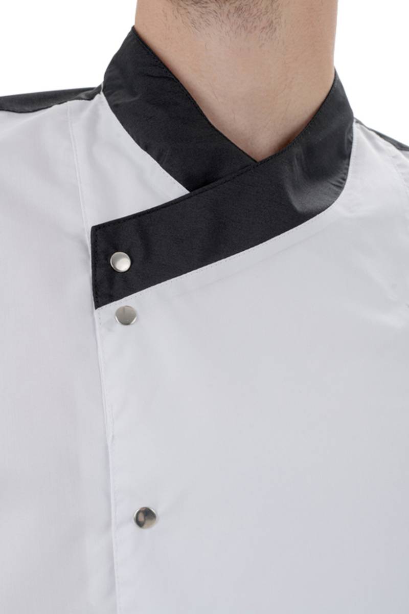 Представляем Вашему вниманию двубортную куртку поварского костюма, которая имеет прямой крой, среднюю длину и втачной рукав с манжетами длиной 3/4, она не сковывает движения и обеспечивает комфорт во время рабочего процесса. Современный стиль куртке придает воротник стойка, переходящий в планку. Застежка на кнопках не только стильно выглядит, но и делает изделие еще более удобным. Небольшой кармашек на левом рукаве является декоративным и функциональным элементом. Дизайн изделия становится еще интереснее благодаря спинке с отрезной кокеткой и отрезными бочками из сетки.